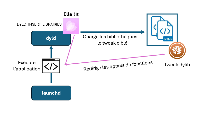 Par défaut, lorsqu’un processus est lancé, iOS utilise dyld (Dynamic Linker) pour charger les bibliothèques dynamiques dans l’espace du processus. ElleKit intervient à bas niveau en s’intégrant au processus de chargement dyld. Il injecte sa bibliothèque libellekit.dylib